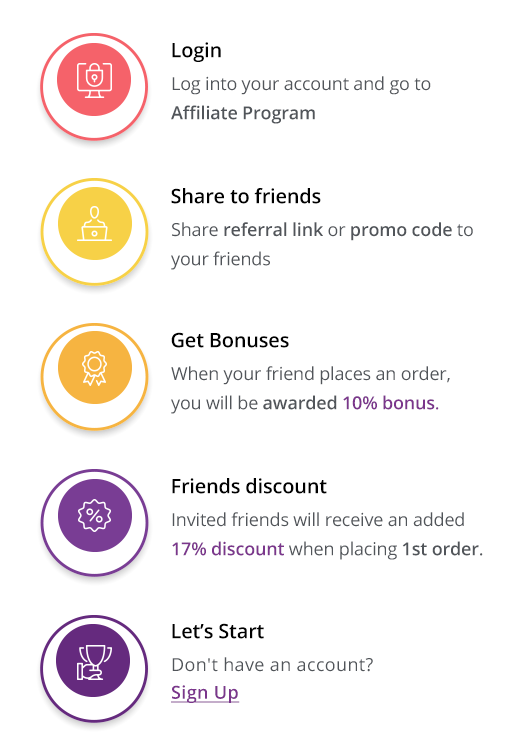 When participating in our affiliate scheme, you will get bonuses every time the users whom you have advised to use our online services will place their orders on our website. The obtained bonuses will be accumulated in your personal account and can be used for buying research papers, essays, speeches, and other projects from us. In case you do not have enough bonuses to pay for your piece of writing, you may use both your own cash and the earned points.